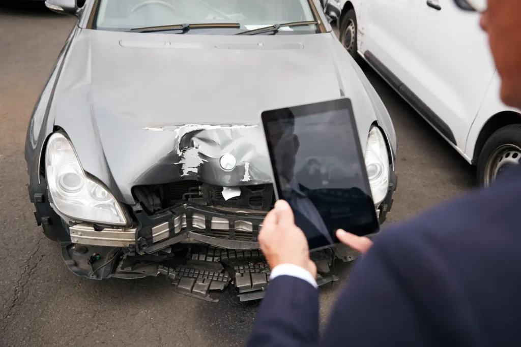 Der KFZ Gutachter prüft das Fahrzeug gründlich. Er fotografiert die beschädigten Bereiche und nimmt die Fahrzeugdaten auf.